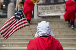 Women dressed in Handmaids red cloaks march at State house to protest Supreme Court leaked documents Roe vs. Wade